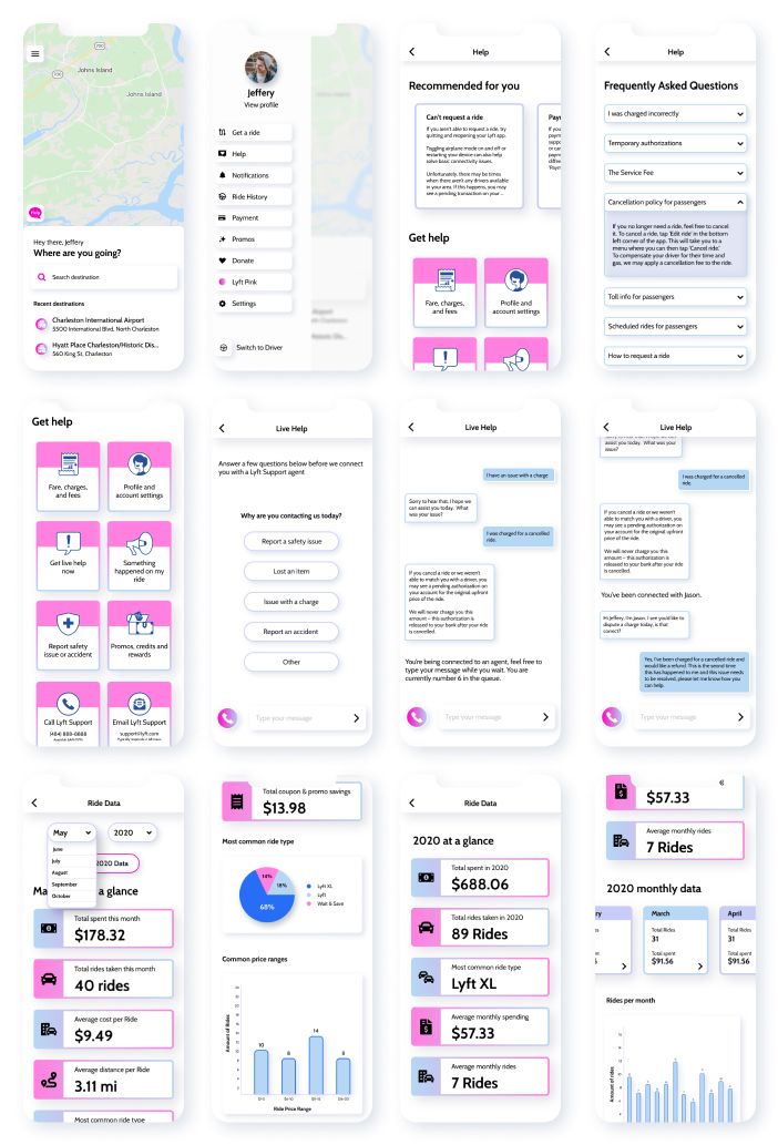 Our thought process while creating our new design was to focus on prioritizing information architecture and hierarchy, navigation, and usability, while improving on brand personality. We wanted to solidify our process flows to be easily recognizable. We showcased this in our Live Help feature, where riders would need to state their problem initially, resulting in being in contact with a Lyft support agent. In our Ride Data feature, we kept the flow as it is on the Lyft app. However, we introduced another dimension within the preexisting Ride History by simply adding a button indicating the ability to view ride data. Overall we always focused on usability: how can we make these features easily accessible? We added a button on both the homepage for Live Help, and the Ride History page. These quick and easily accessible buttons introduced another seamless experience.