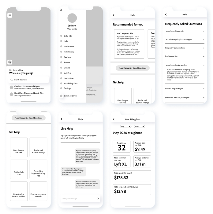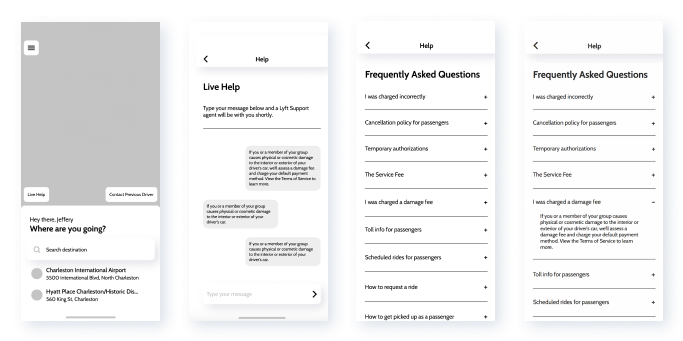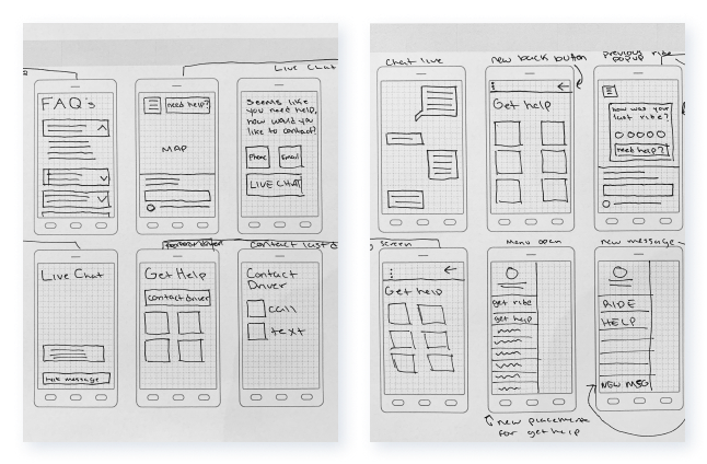 The wireframes focused on building out a basic help page along with a pop-up message to contact a driver. The help page included FAQ, topic categories, and a link to a live help page. As for the contact driver feature, its purpose is to allow riders to be able to contact drivers for any lost items.