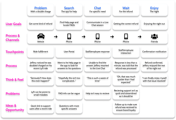 The user journey is the expected experience a user would go through when using our app. It maps out the thinking process and general emotional states of the user while they go through various touchpoints. The journey map was completed through the collaboration of Britney and Ransky.