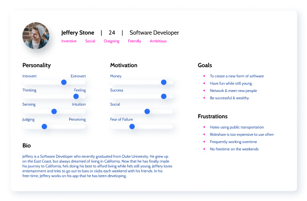 All team members were tasked with the creation of a user persona to give a face to common users types of the Lyft app. These were created based on the previous user research of the needs, pains, and goals of our audience.